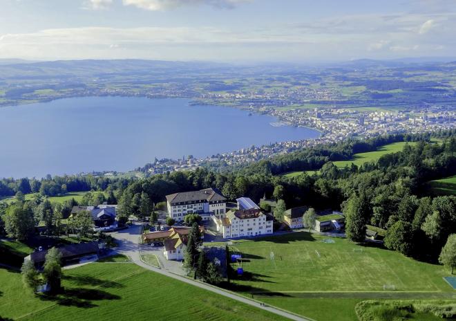 The school is located on the Zugerberg Mountain, at an altitude of about 1,000 meters. A short funicular ride takes students to the 60-acre campus. From its territory you can see farmlands with grazing cattle, a forest with its inhabitants: foxes and deer. The panoramic view of the lake and snow—capped mountains creates an amazing atmosphere for relaxation and a calm one for learning.